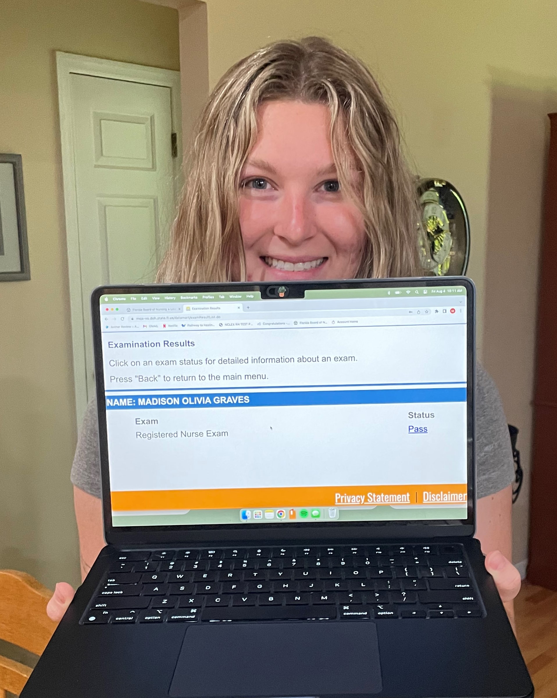 Floy Graves is happy to announce that her youngest daughter, Madison Graves, has passed the NCLEX-RN (National Council Licensure Examination – Registered Nurse) Certification and is now officially Madison Graves, RN!