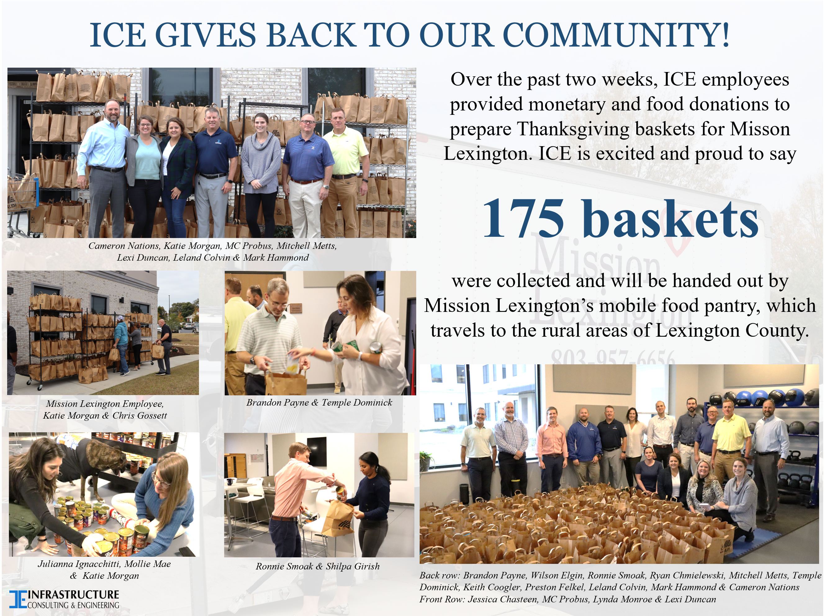Over the past two weeks, ICE personnel provided monetary and food donations to prepare Thanksgiving baskets for local non-profit, Mission Lexington. ICE is thrilled to announce 175 baskets were collected and will be distributed by Mission Lexington’s mobile food pantry, which travels to the rural areas of Lexington County, SC.
