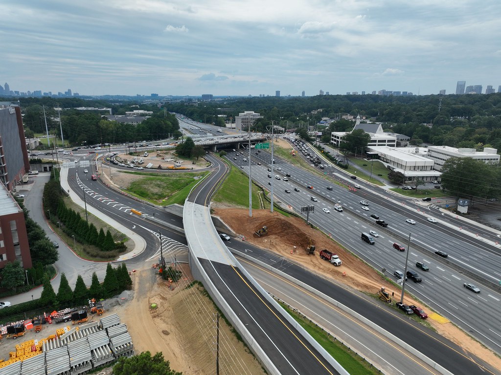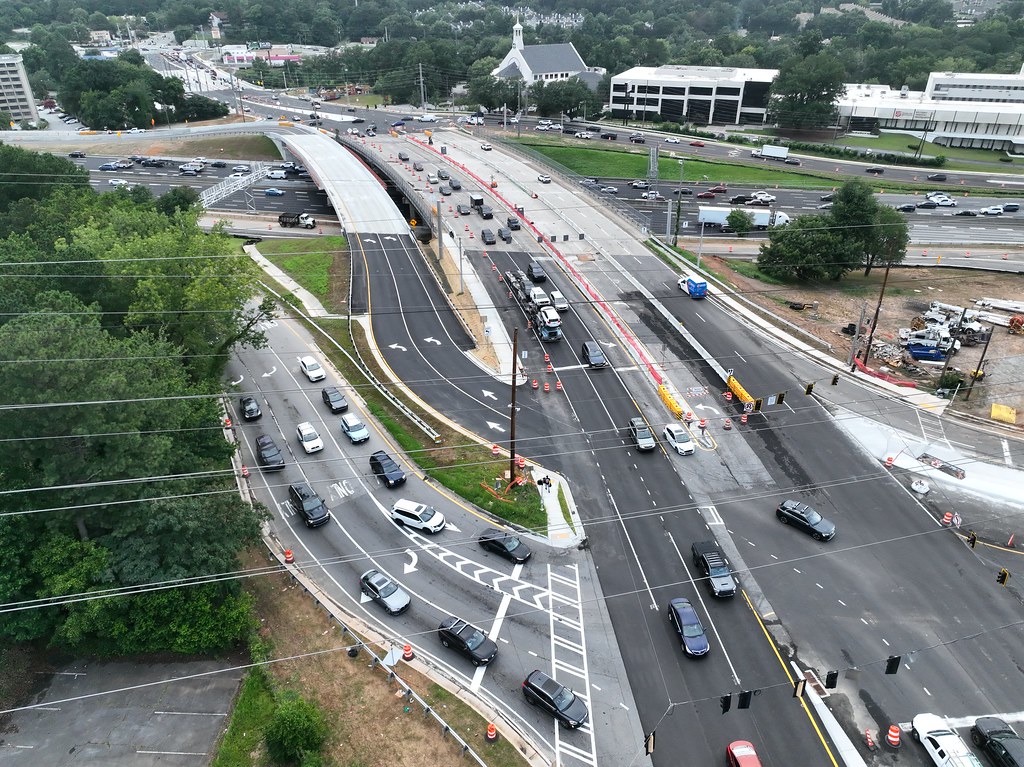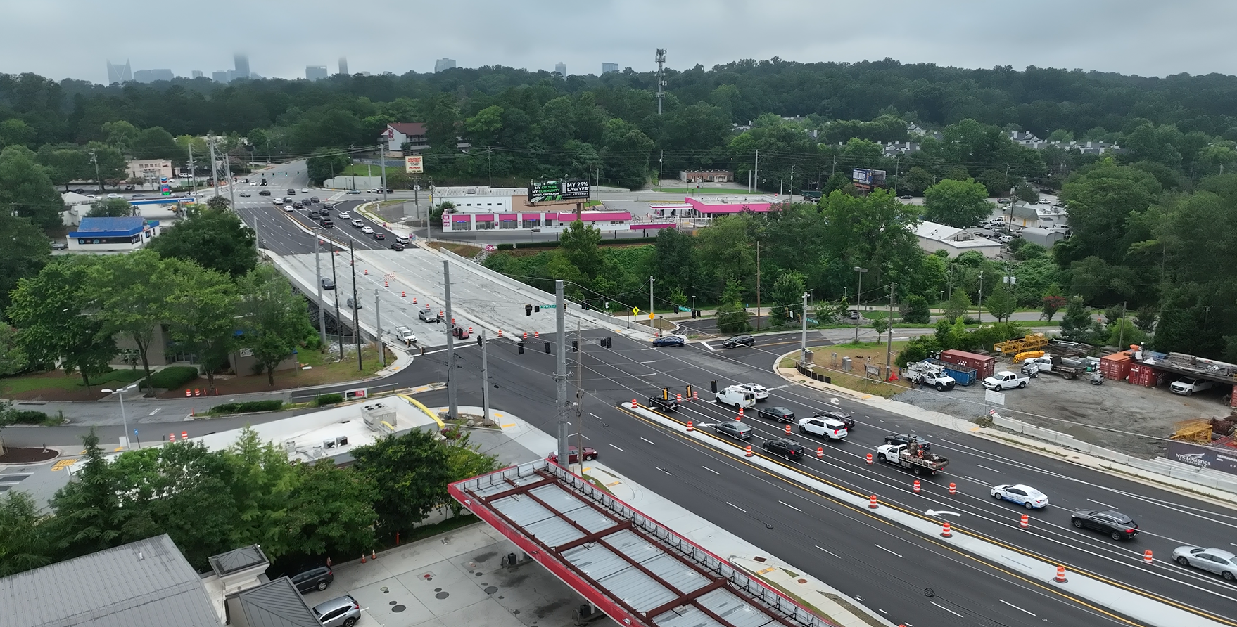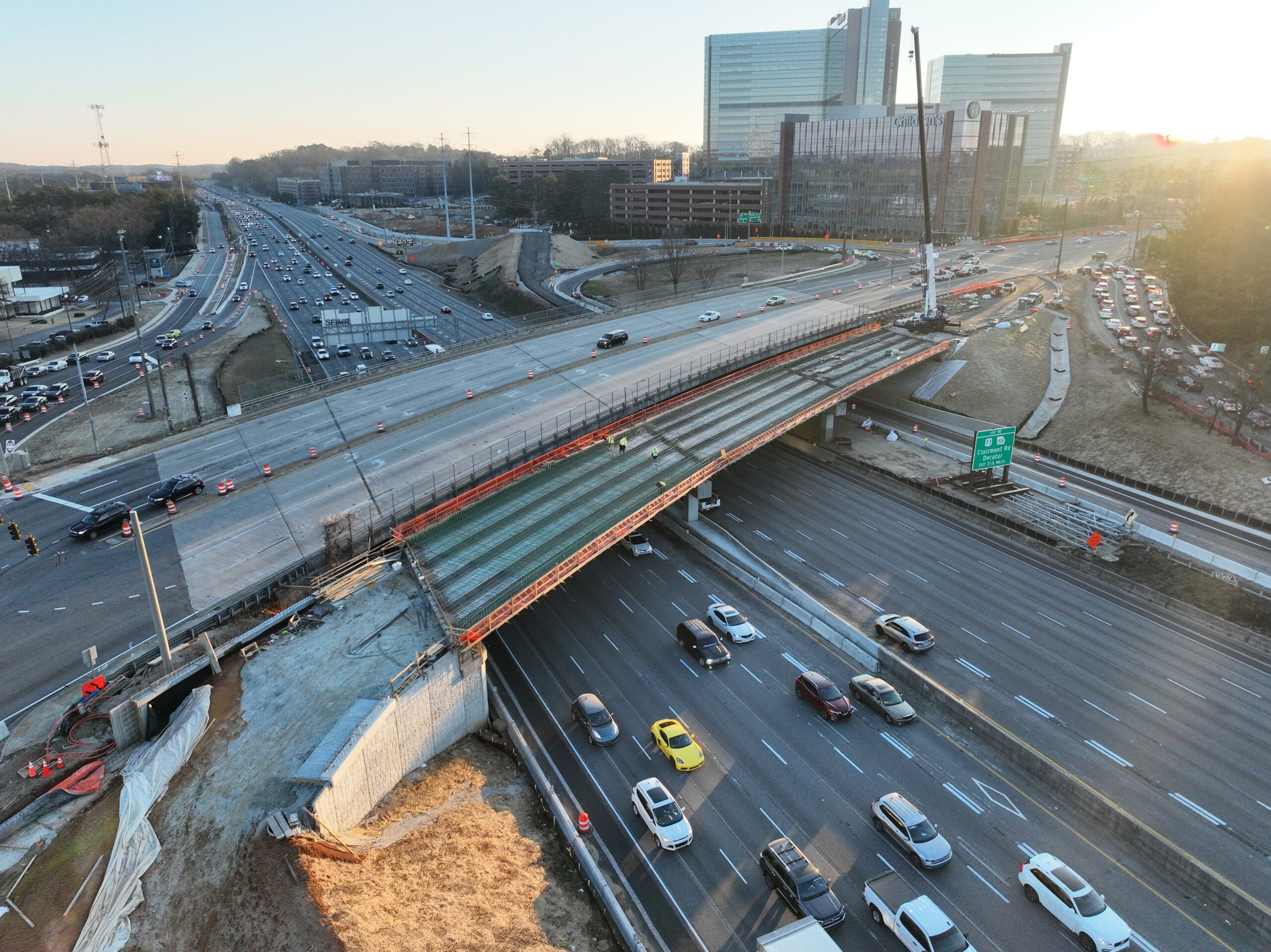 This design-build interchange reconstruction project consisted of adding an additional structure over I-85 at SR 42/North Druid Hills Road to provide a displaced left turn (DLT) for the westbound to southbound movement. It also included the addition of a braided ramp from the I-85 northbound off-ramp to the I-85 Access Road with a new bridge for the I-85 northbound on-ramp. The work also included replacing the SR 42/North Druid Hills Road bridge over North Fork Peachtree Creek, lighting, realigning the roadway at the new driveway location of Children’s Healthcare of Atlanta (CHOA), and rehabilitation/modification of the existing SR 42 bridge over I-85.