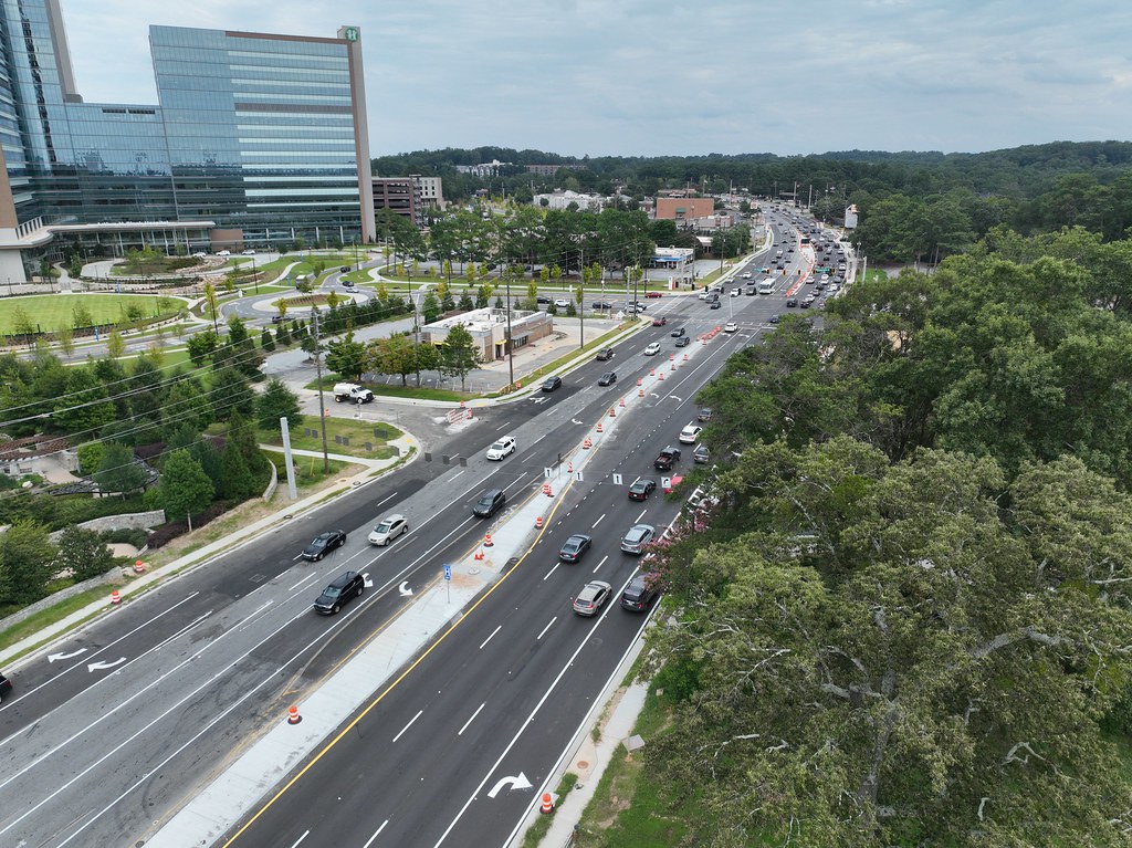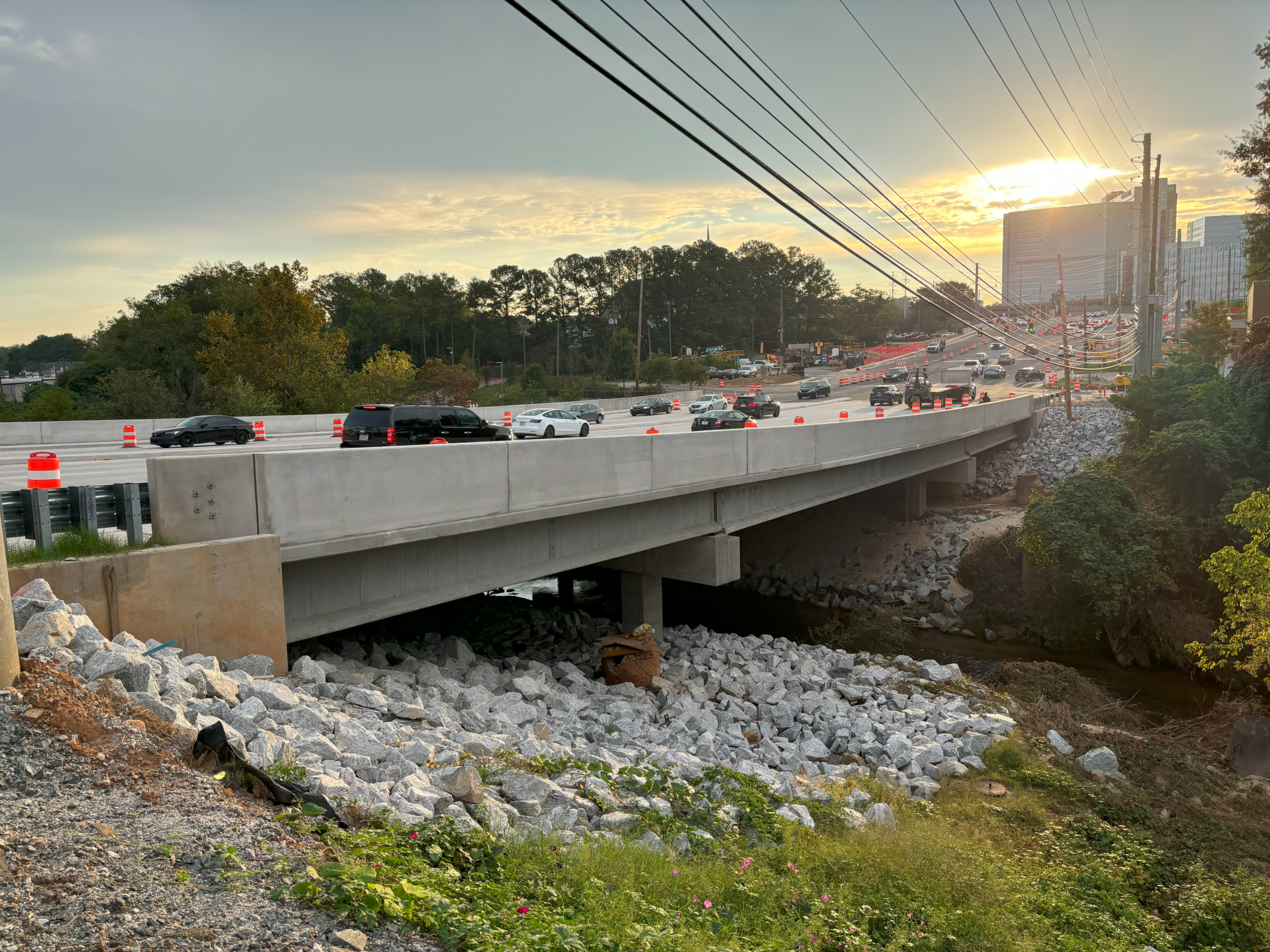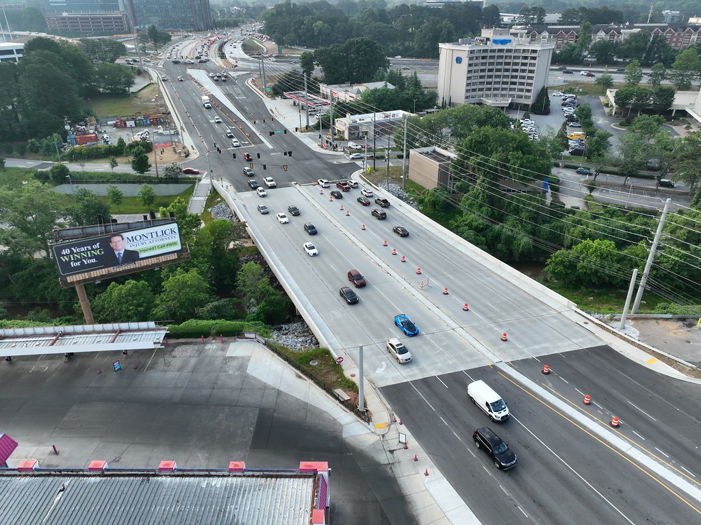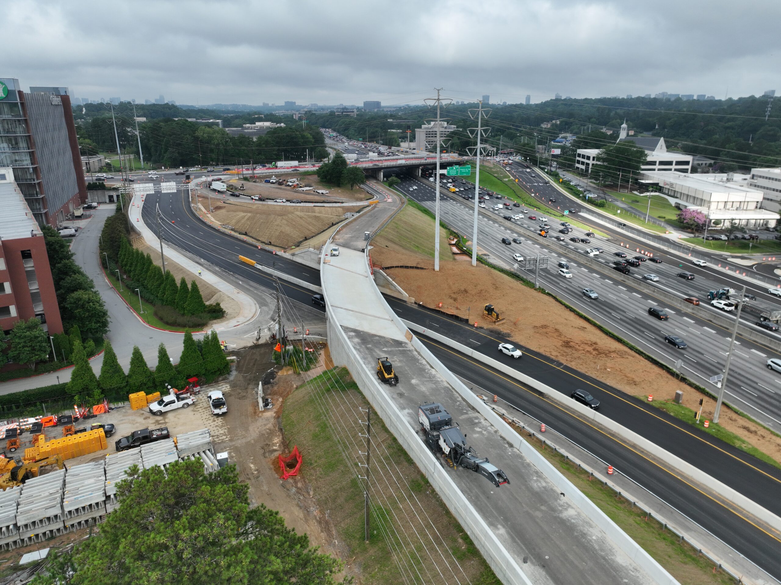 This design-build interchange reconstruction project consisted of adding an additional structure over I-85 at SR 42/North Druid Hills Road to provide a displaced left turn (DLT) for the westbound to southbound movement. It also included the addition of a braided ramp from the I-85 northbound off-ramp to the I-85 Access Road with a new bridge for the I-85 northbound on-ramp. The work also included replacing the SR 42/North Druid Hills Road bridge over North Fork Peachtree Creek, lighting, realigning the roadway at the new driveway location of Children’s Healthcare of Atlanta (CHOA), and rehabilitation/modification of the existing SR 42 bridge over I-85.