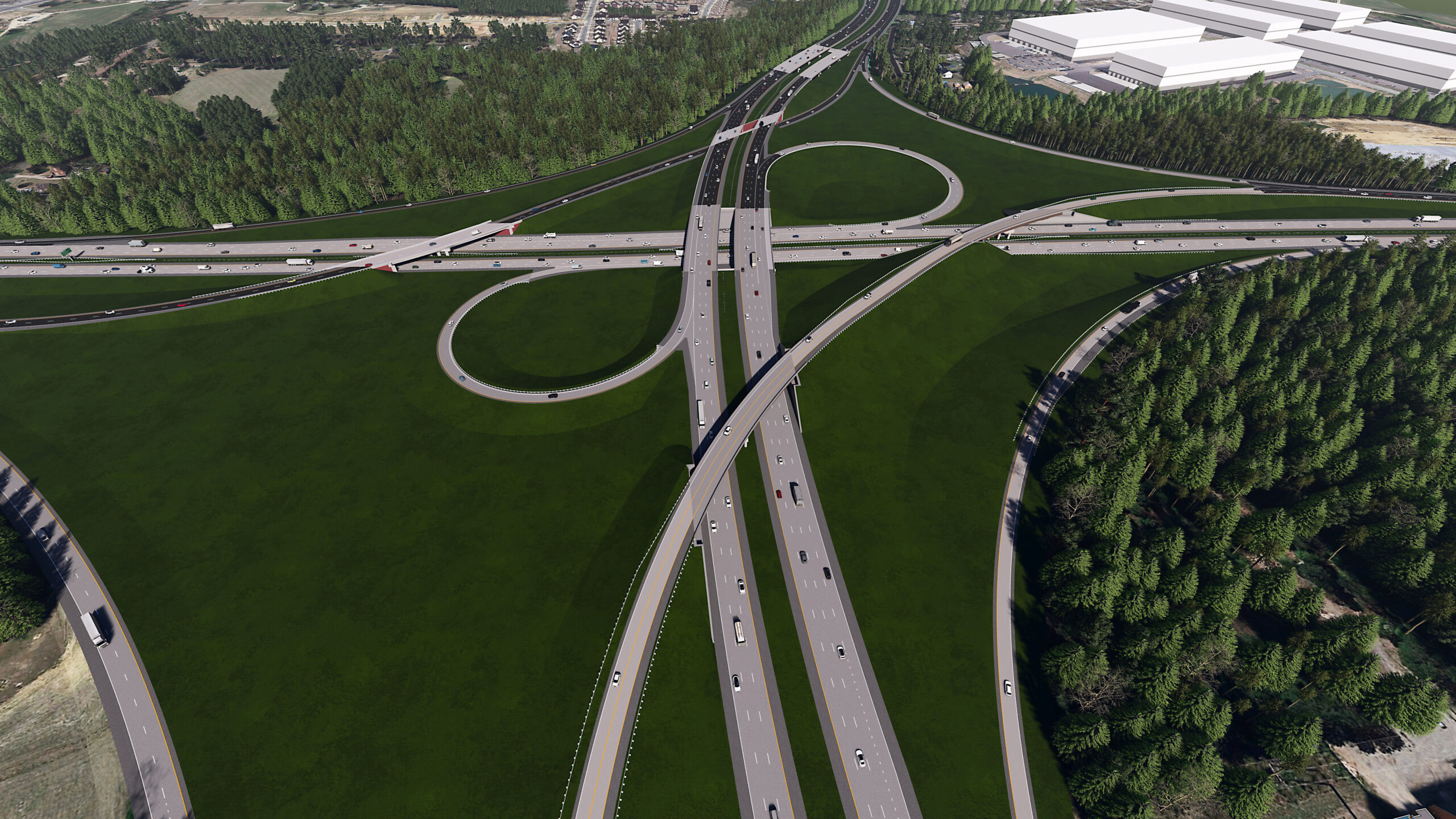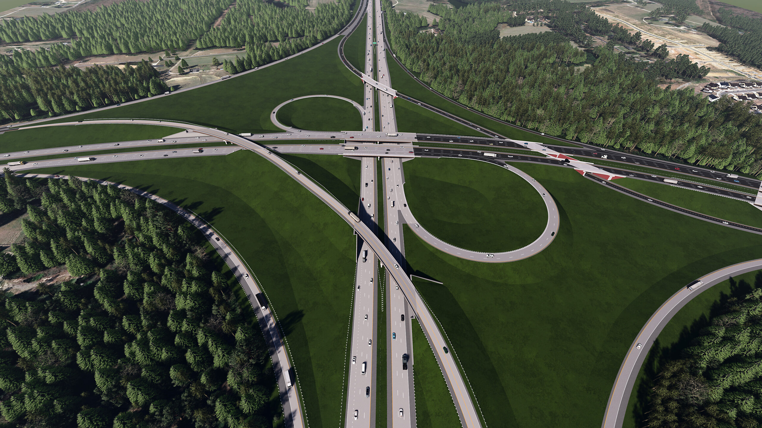 This design-build project involved designing and constructing a multi-lane tolled expressway, from south of SR-2542 (Rock Quarry Road) to I-87/US-64/US-264, including new interchanges, roadway widening, and bridge structures to accommodate increased traffic capacity. Key elements included roadway design and construction to establish new expressway lanes with controlled access for improved traffic flow; bridge and structure design, featuring multiple bridges, overpasses, and culverts to ensure seamless connectivity and minimize environmental impact; and traffic management and ITS, incorporating ITS for tolling, traffic monitoring, and safety enhancements. Additionally, the project included drainage and environmental compliance measures, such as stormwater management, erosion control, ecosystem protection, right-of-way acquisition, and utility coordination, to ensure a smooth integration with existing infrastructure while minimizing disruptions.